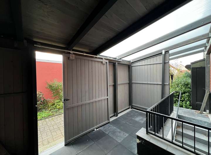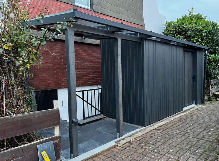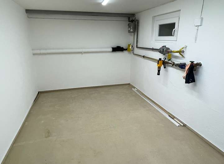 Das Haus verfügt über zwei Kellerräume. Der Heizungskellerraum ist gefliest. Der andere Kellerraum ist mit hellem Teppich ausgestattet und wirkt daher nicht wie ein Keller. Von diesem Raum gelangt man durch eine Tür und Stufen nach oben in den ganz neu entstandenen hellen Unterstand und Abstellraum. Das Dach des Anbaus ist für ein Balkonkraftwerk geeignet, welches vom Mieter nachgerüstet werden kann.