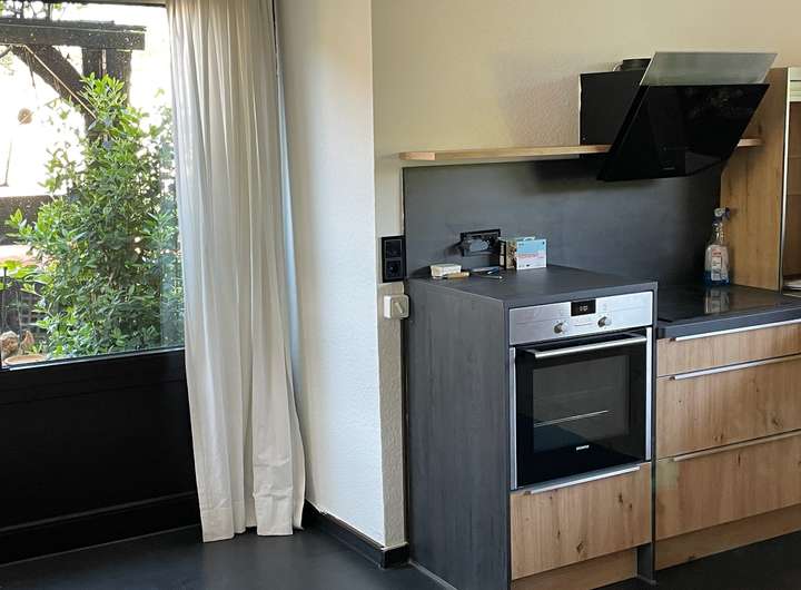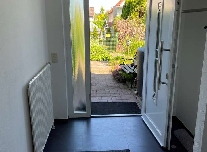 Wenn man durch die, durch einen Vorbau überdachte, Haustür tritt gelangt man in einen hellen, geräumigen Flur mit großer Garderobe. Daran schließt ein GästeWC an. Vom Flur gelangt man in die hübsche Wohn-Ess-Küche mit kleinem Erker Richtung Süden. Die Einbauküche mitsamt hochwertiger Geräte ist 4 Jahre alt. Die Geräte können abgekauft werden.