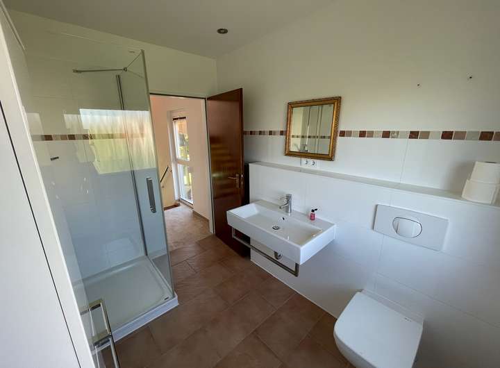 Im nächsten Zwischengeschoss findet man dann zum Einen das Badezimmer mit großer Dusche und Handtuchheizkörper, als auch ein großes Schlafzimmer mit hoher holzvertäfelter Decke.