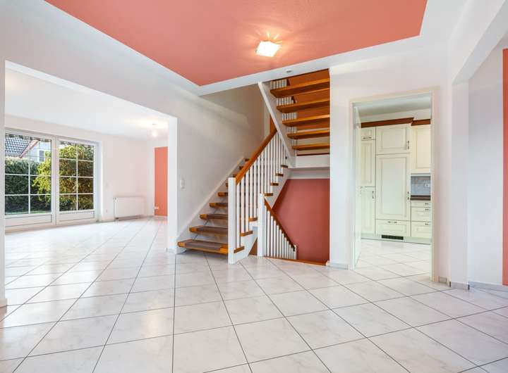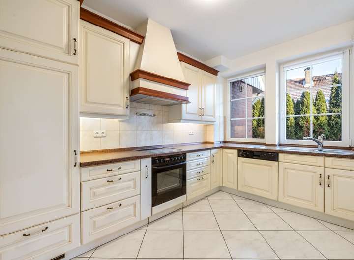 Im Erdgeschoss schaffen eine Deckenhöhe von 2,60m, eine einladende Landhausküche und eine hochwertige Holz-Podesttreppe eine angenehme Wohnatmosphäre.