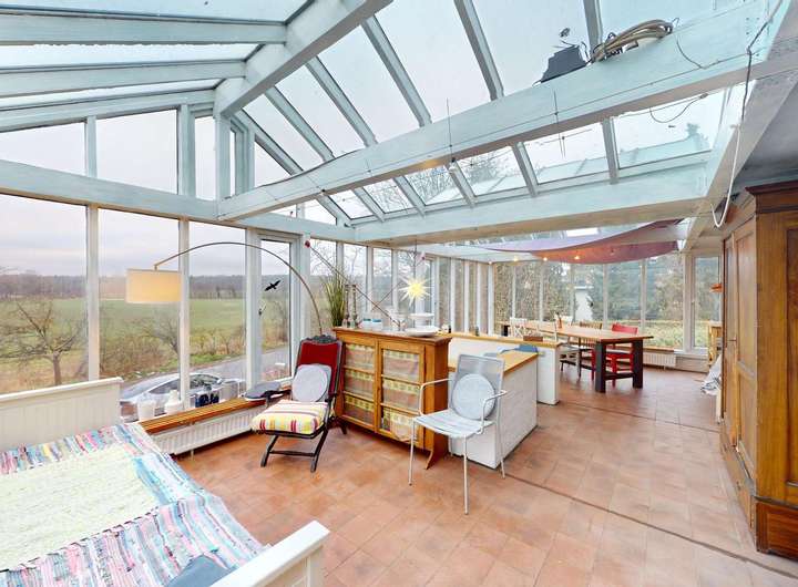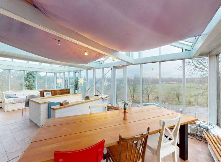 • Offenes Wohnkonzept des Hauptwohnbereichs mit großem, integriertem Wintergarten (Anbau 1982)