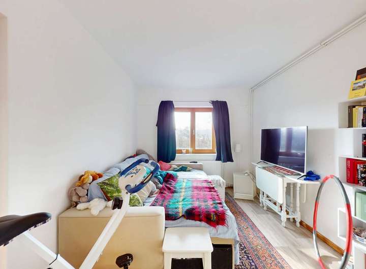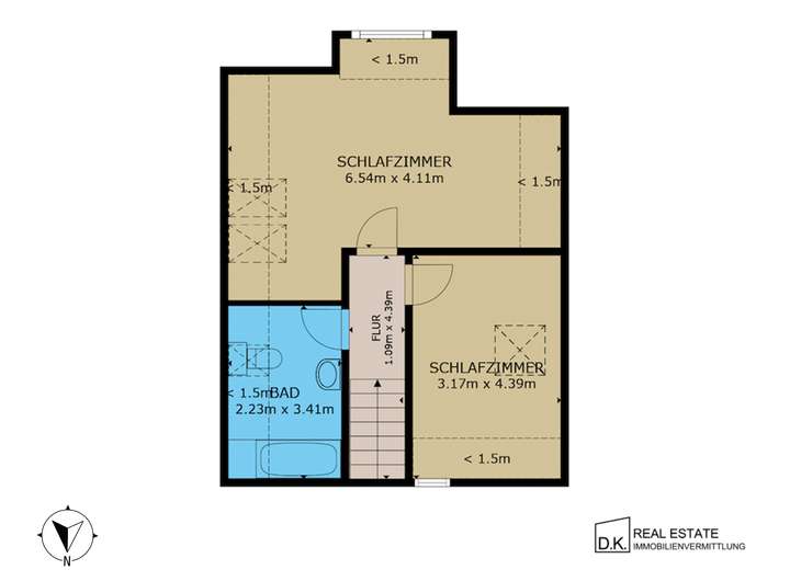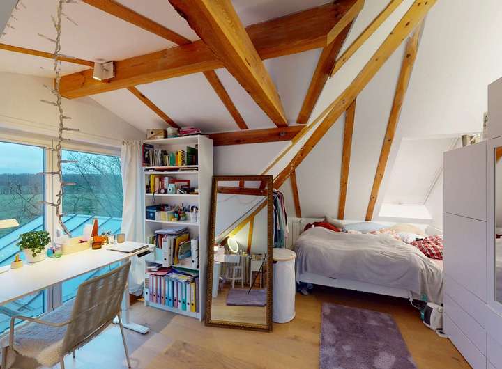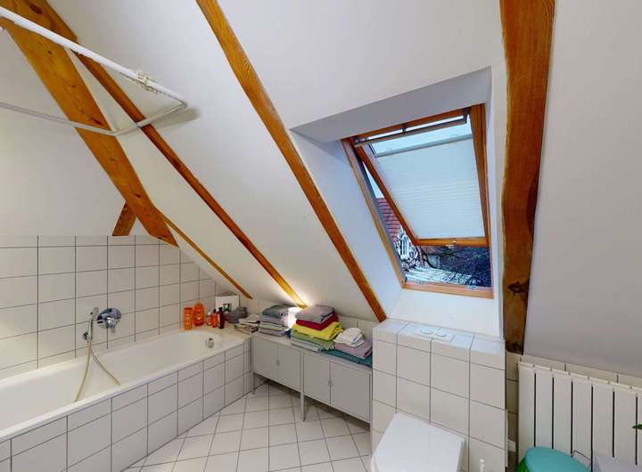 Im Obergeschoss erwarten Sie weitere zwei Zimmer, die sich ideal als Kinder-, Schlaf- oder Arbeitsräume eignen. Das helle Tageslichtbad mit Badewanne bietet höchsten Komfort und fügt sich harmonisch in das Gesamtbild des Hauses ein.