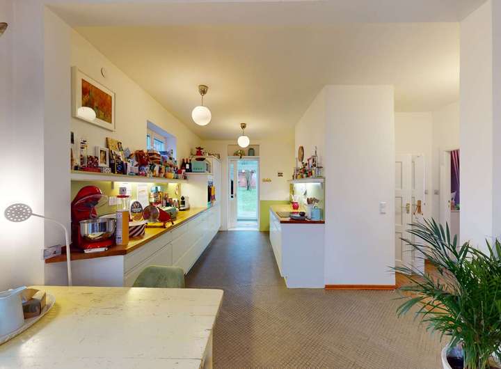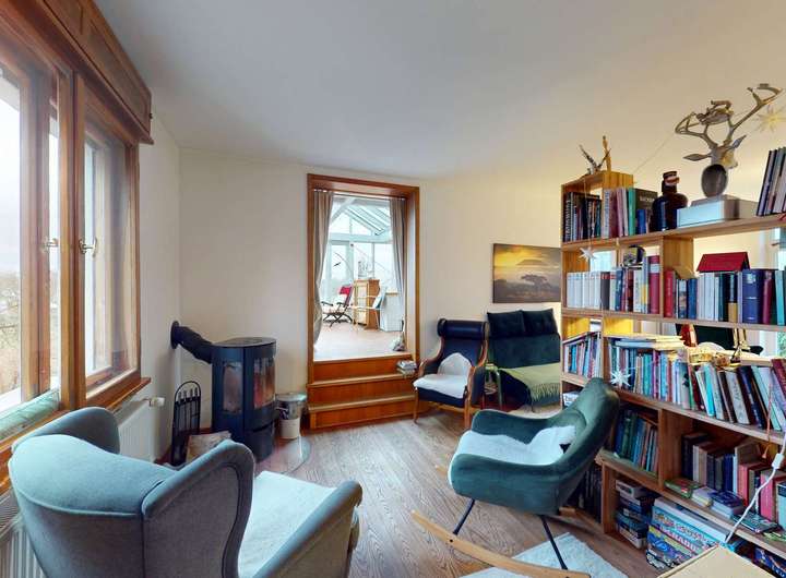 Der offene Wohnbereich überzeugt mit einer durchdachten Raumaufteilung und einem daran angebundenen lichtdurchfluteten Wintergarten (Anbau 1982), der als harmonische Erweiterung des Wohnraums dient. Die südliche Hauptausrichtung sorgt für ganztägigen Sonneneinfall und schafft eine helle, freundliche Atmosphäre. Vom Wohn- und Essbereich genießen Sie einen unverbaubaren Weitblick ins Grüne – eine Seltenheit in dieser begehrten Lage. Die angrenzende offene Wohnküche bietet viel Platz für kulinarische Entfaltung, während die großzügigen Terrassen zum Verweilen im Freien einladen. Ein weiteres Zimmer im Erdgeschoss eignet sich ideal als Arbeits- oder Gästezimmer, ergänzt durch ein praktisches Gäste-WC.