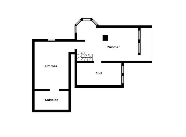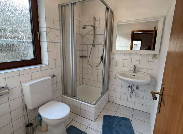 Der Grundriss im Obergeschoss ist sehr ähnlich. Zur Straßenseite befindet sich ein großes Schlafzimmer. Linksseitig vom Flur führt ein Durchgangszimmer in ein im Anbau befindliches Schlafzimmer mit angrenzenden Balkon. Das danebenliegende Tageslichtbad ist modern und wurde mit WC, Waschbecken und Dusche mit Duschkabine ausgestattet.