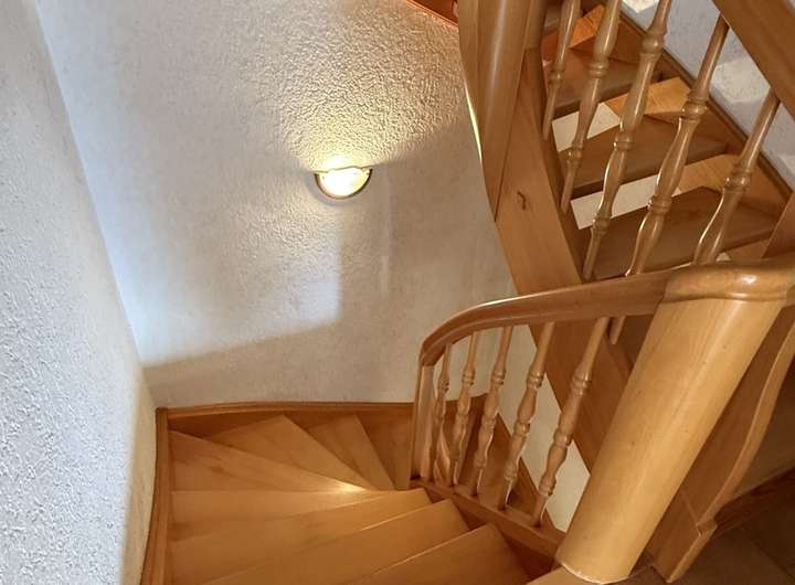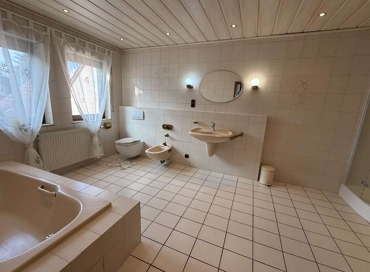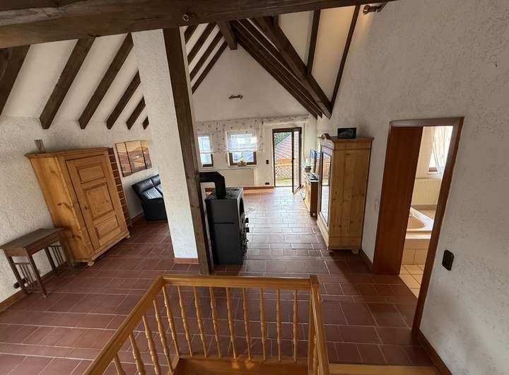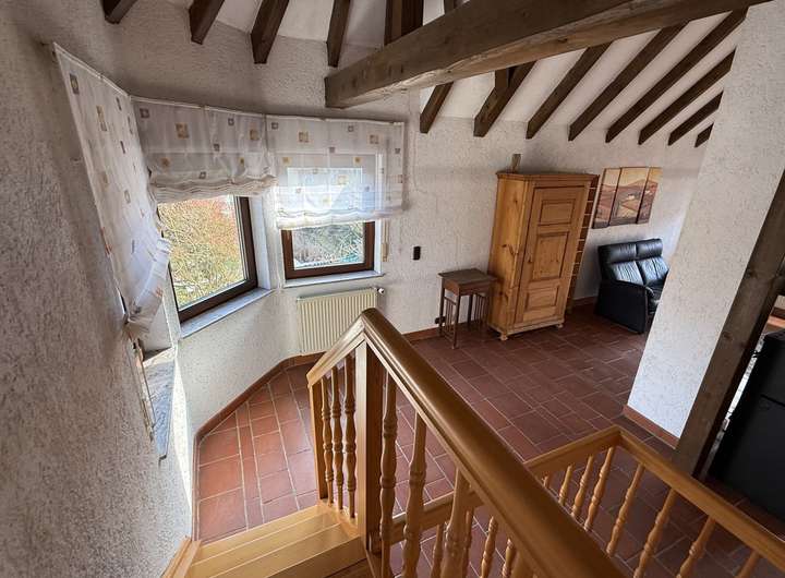 Highlight des Hauses ist sicher das Dachgeschoss. Das geräumige Wohnzimmer wurde nach oben hin offen in das spitze Dach hinein gehalten und mit Sichtbalken geschmackvoll in Szene gesetzt. Ein alter Ofen ziert diesen Raum, der Zugang zu einer überdachten Loggia gewährt. Direkten Zugang hat man vom Wohnzimmer auch noch zu einem sehr großen Tageslichtbad mit WC, Bidet, Waschbecken, Dusche mit Duschkabine und eingelassener Badewanne.