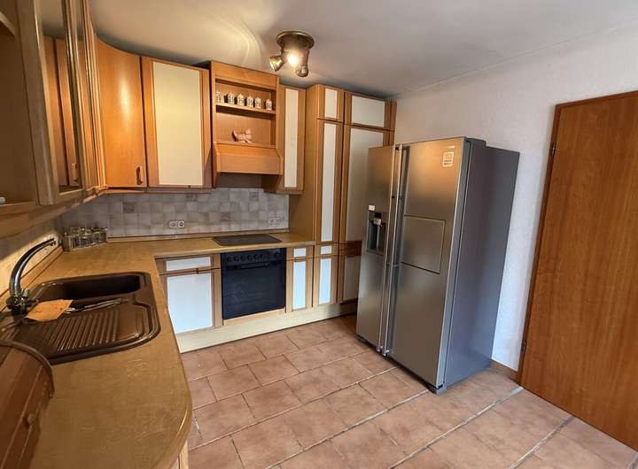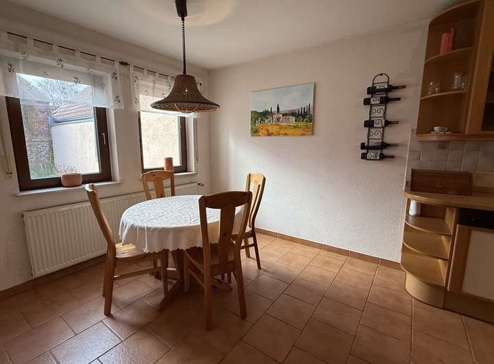 Der Zugang erfolgt ebenerdig über den Kellerbereich. Hier befinden sich zwei Kellerräume sowie ein Gäste-Duschbad. Eine schöne Holztreppe führt dann in die nächste Etage. Durch die leichte Hanglage gelangt man vom Wohnzimmer auf die Terrasse und direkt in den angrenzenden Garten. Eine geräumige Küche mit Einbauküche sowie ein sehr gemütliches Erkerzimmer, das sich zum Beispiel als Ess- oder Arbeitszimmer eignen könnte, befinden sich ebenfalls auf dieser Etage.