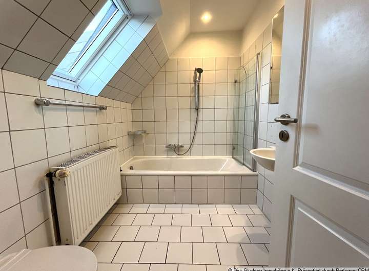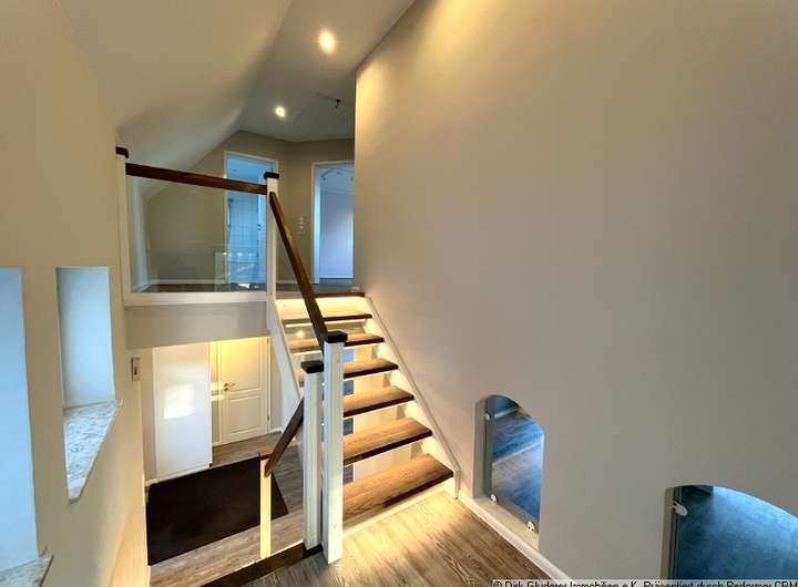 Sie betreten das Haus von einem kleinen, unscheinbaren Innenhof, der unter anderem einen Außen-Stellplatz und eine Garage für Sie bereit hält. Die Diele erschließt über eine halbe Treppe den großzügigen Wohn- und Essbereich mit integrierter Küche , ein Fernseh- oder Arbeitszimmer mit vorgelagertem kleinen Wintergarten sowie ein Schlafzimmer und ein schickes Duschbad. Weiterhin bietet das Erdgeschoss ein weiteres kleines Zimmer, einen Hauswirtschaftsraum und einen Nebeneingang, der auch als Zutritt zum Keller dient.
