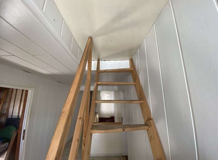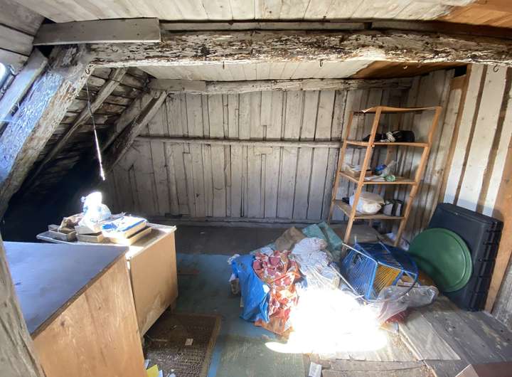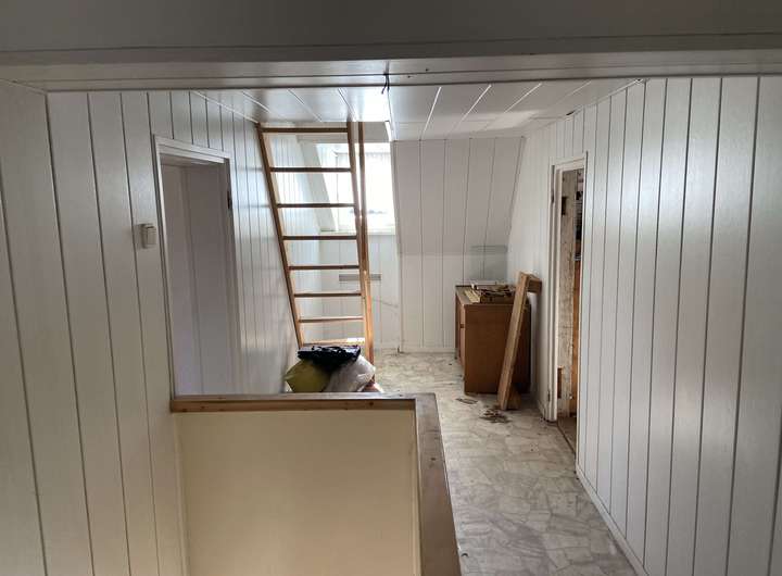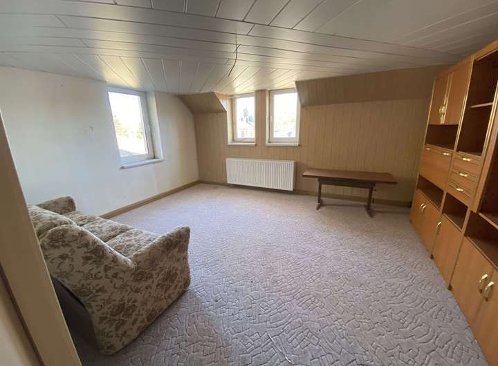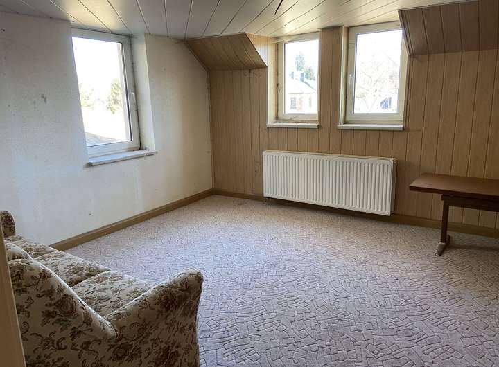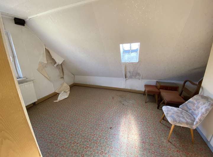 Über eine Holztreppe gelangen Sie in das Obergeschoss mit fünf weiteren Zimmern. Ob Kinderzimmer, Schlafzimmer, Homeoffice oder Küche – hier können Sie Ihre individuellen Wohnträume verwirklichen und die Raumaufteilung nach Ihren Bedürfnissen gestalten. Zusätzlich befindet sich hier die Gastherme des Hauses (nicht funktionsfähig). Ein Spitzboden bietet weiteren Stauraum.
