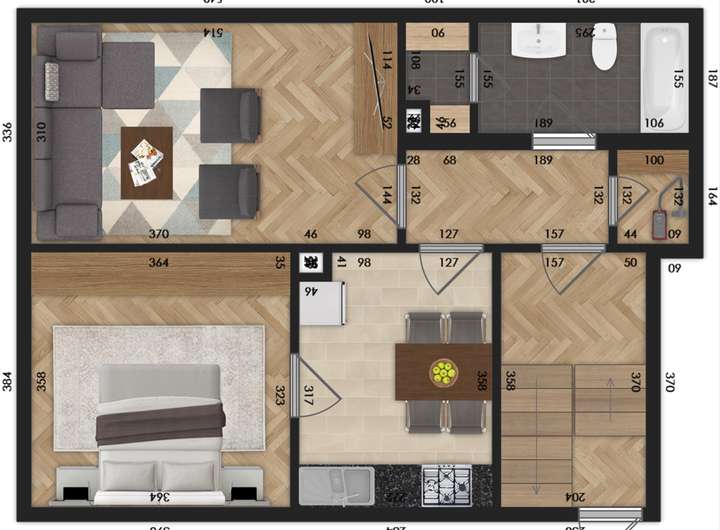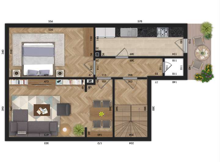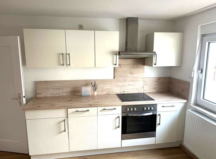 - 2 große Zimmer, Küche mit Einbauküche, WC, Terrasse