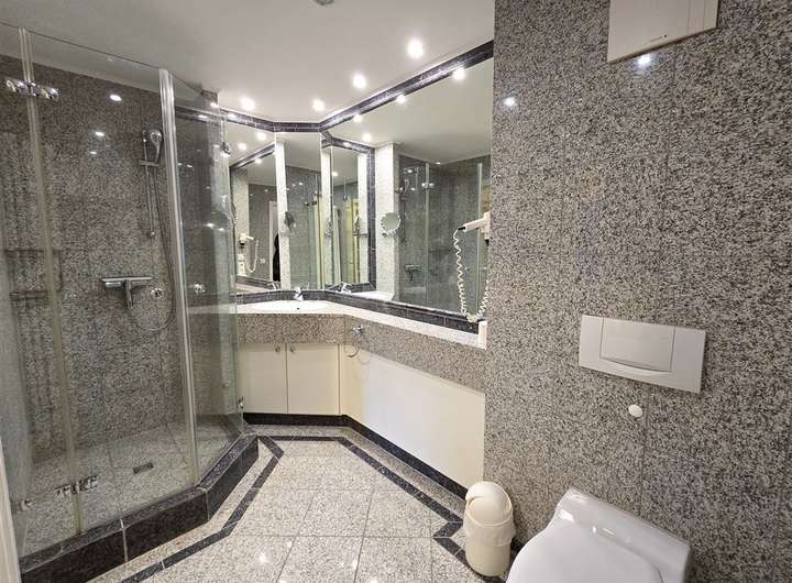 Das moderne Badezimmer liegt im Eingangsbereich der Wohnung. Es ist über den Flur zu erreichen. Das Bad ist mit italienischem Granit gefliest und wirkt durch den großen Wandspiegel hell und geräumig.