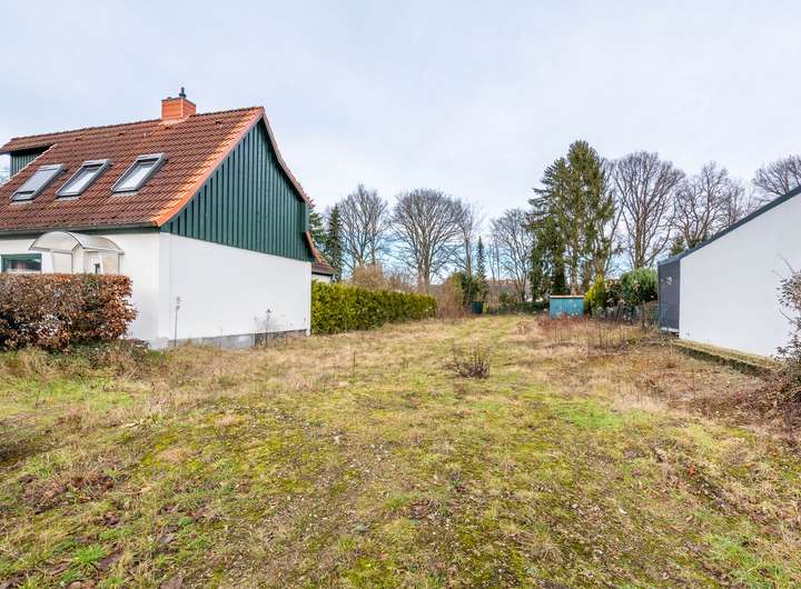 Auf dem Grundstück befand sich bisher eine kleine Doppelhaushälfte mit Anbau. Die angrenzende Giebelwand der verbliebenen Doppelhaushälfte wurde bereits mit einem Dachüberstand und neuer Fassadengestaltung saniert. Das Grundstück ist durch den vorhandenen Baum- und Heckenbestand der Nachbargrundstücke ausreichend sichtgeschützt und eingefriedet.