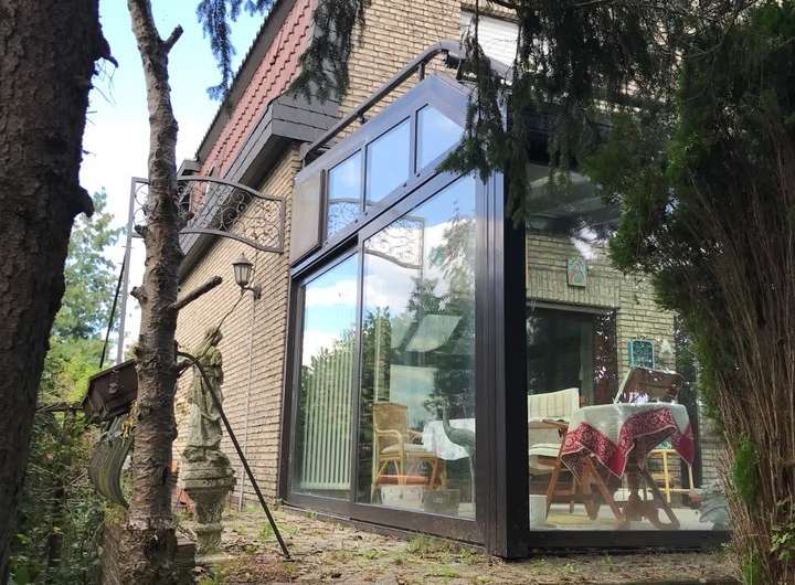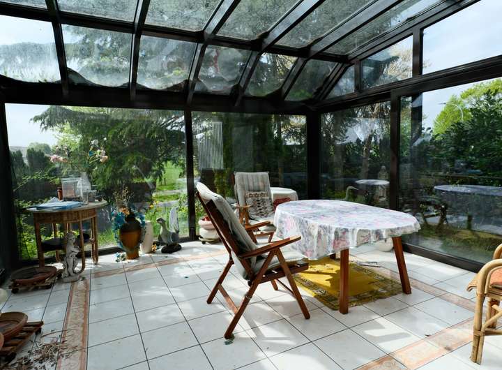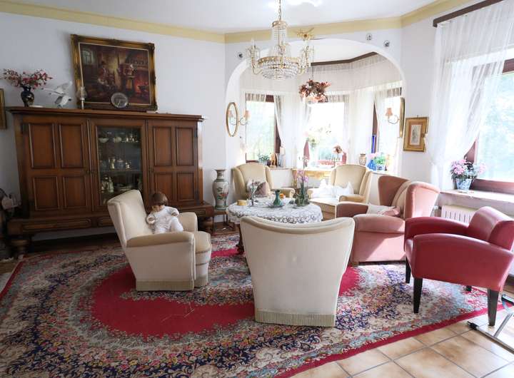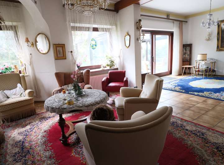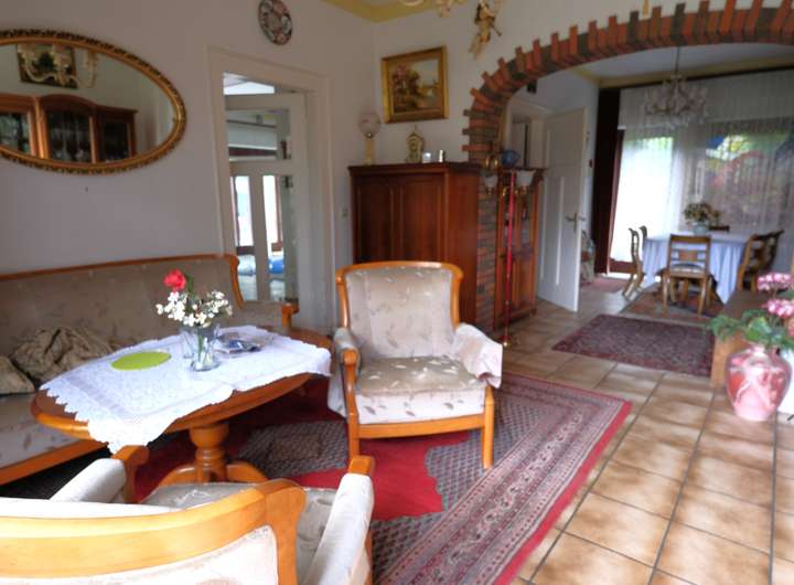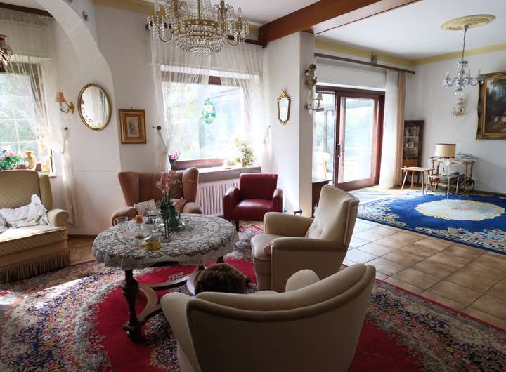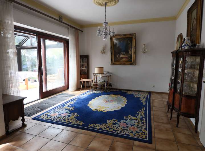 Wohnzimmer mit Erker únd schöner Wintergarten (mit Blick über die Felder!!) Schiebetüren zum Garten.
