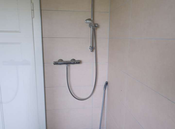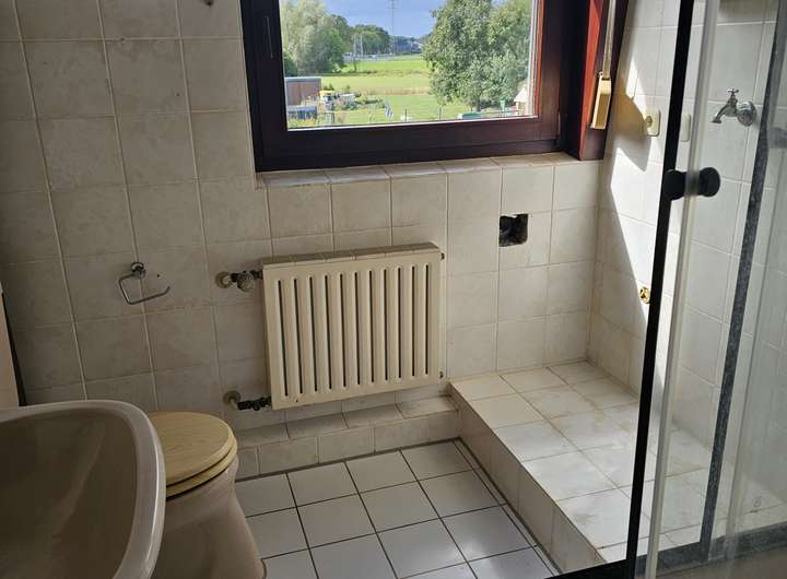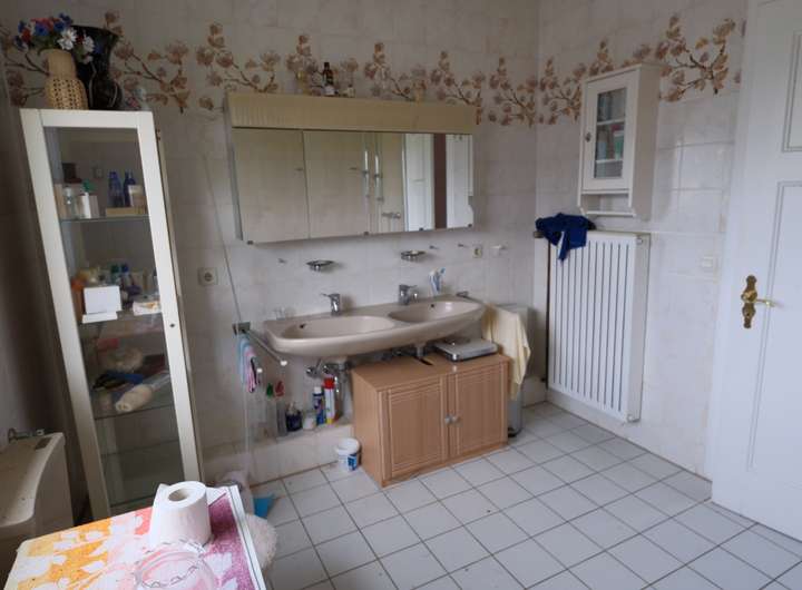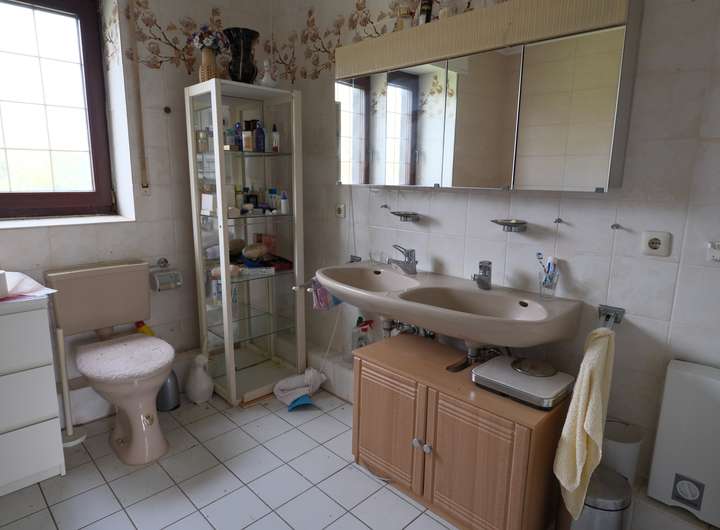 Badezimmer mit ebenerdige Dusche, doppelter Waschtisch und WC (alles erneuert).