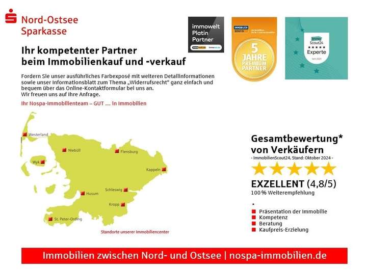 2,98 % inkl. ges. MwSt. Die Nord-Ostsee Sparkasse wird mit Gestattung des Verkäufers als Verkäufer- und auch als Käufermaklerin tätig. Die Käufer-Provision ist verdient mit Abschluss des rechtswirksamen notariellen Kaufvertrages und fällig nach Rechnungslegung. Die Sparkasse hat einen provisionspflichtigen Maklervertrag in gleicher Höhe mit dem Verkäufer abgeschlossen. |
