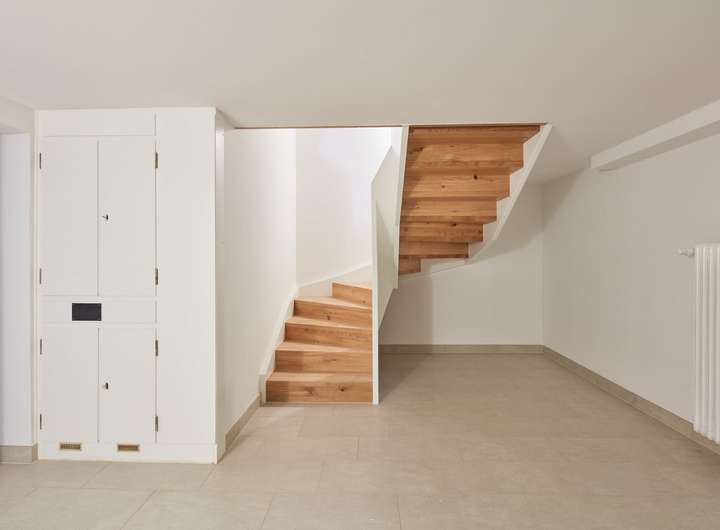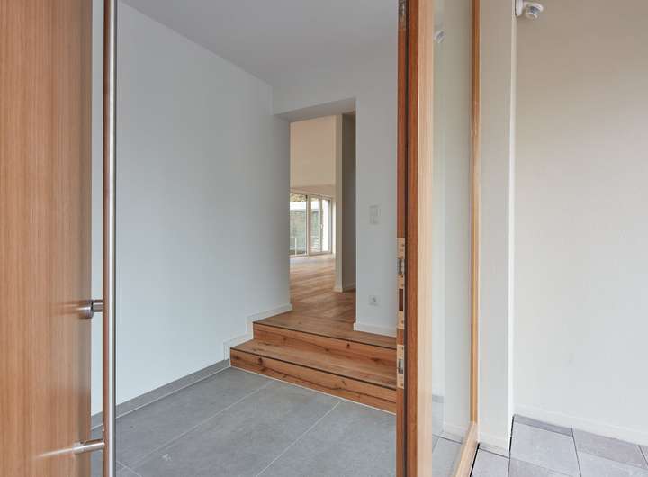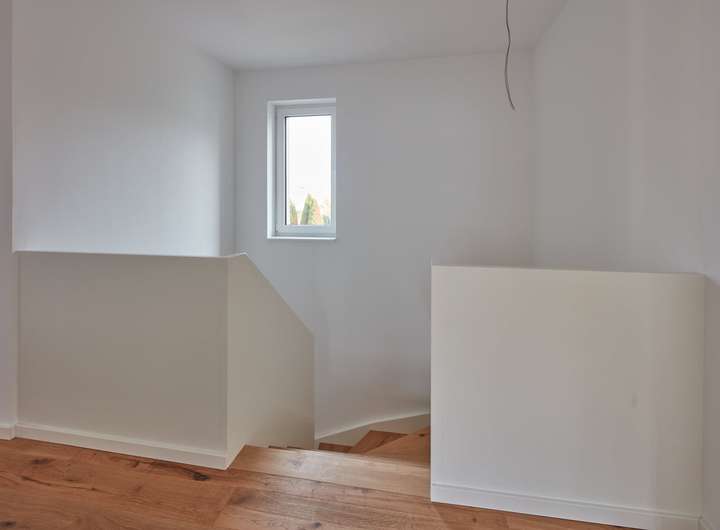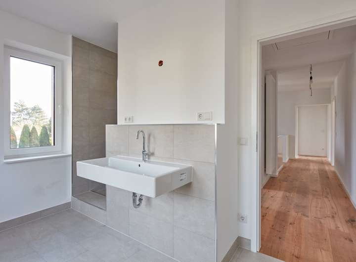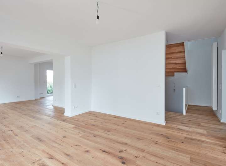 Bodenbeläge: Geölter Eiche-Dielenboden in allen Wohnräumen, Keller und Bäder mit Feinsteinzeugfliesen