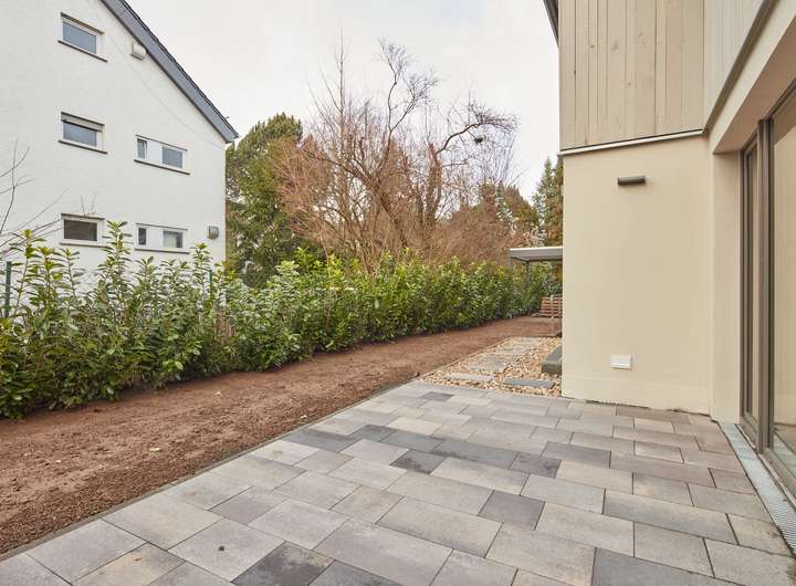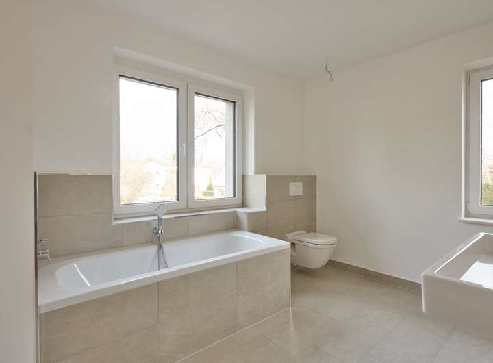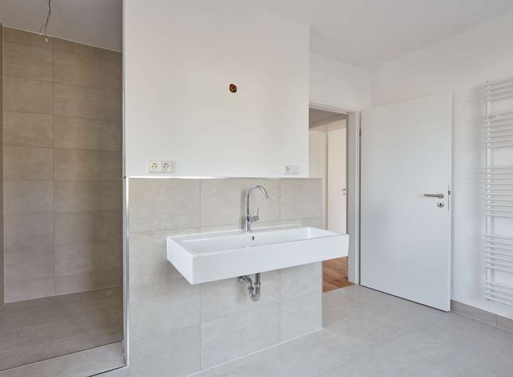 Bäder: Ausgestattet mit deutschen Markenfabrikaten und stilvollen Feinsteinzeugfliesen