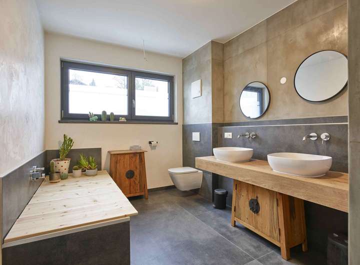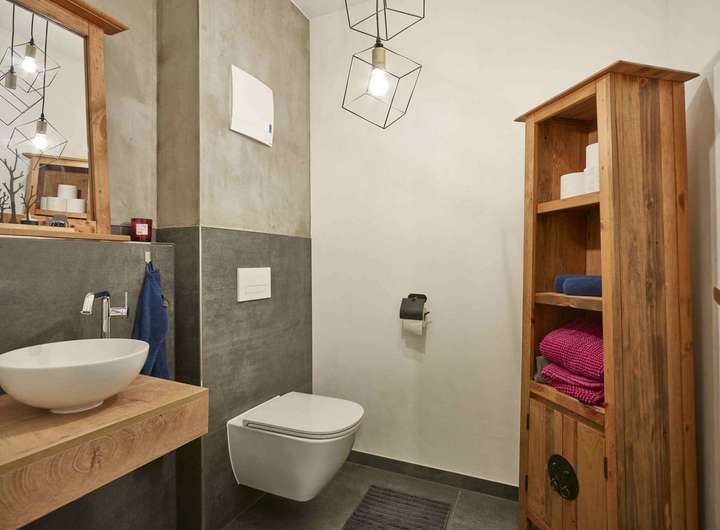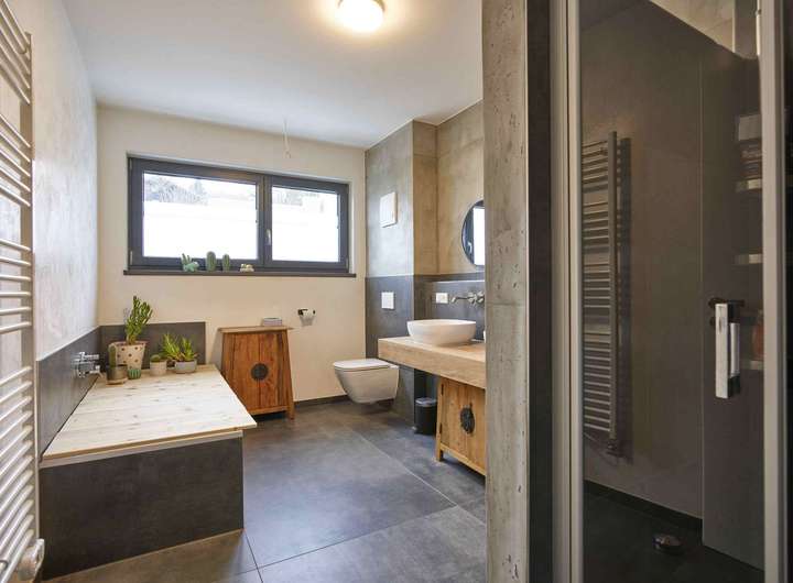 - Bad u. Gäste-WC sind in Betonoptik gespachtelt