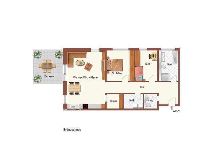 Wohn-/Ess-/Kochbereich, Schlafzimmer, Kinderzimmer oder Büro, Flur, Bad, Gäste-WC, Speis, Hauswirtschaftsraum, Terrasse