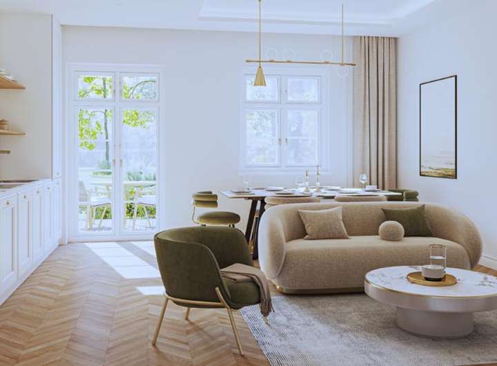 Die Wohnungen in Wünsdorf-Waldstadt bieten eine exklusive Ausstattung, die höchsten Komfort und modernes Wohnen miteinander vereint. Großzügige Raumhöhen von 4,20 m schaffen ein offenes, luftiges Ambiente, das den Räumen eine besondere Weite verleiht. Die Wohnungen sind mit hochwertigen, zertifizierten Materialien ausgestattet, die nicht nur ästhetisch ansprechend, sondern auch nachhaltig sind. Eine moderne Luft-Wärmepumpe sorgt für eine effiziente und umweltfreundliche Wärmeversorgung, die den Energieverbrauch minimiert. Zudem können die Wohnungen optional mit Solardächern ausgestattet werden, was nicht nur die Energieeffizienz erhöht, sondern auch zur Reduktion der Betriebskosten beiträgt. Die durchdachte Bauweise bietet zusätzlich viel Platz für individuelle Gestaltungsmöglichkeiten, sodass jede Wohnung ihren ganz eigenen Charme entfalten kann. In Verbindung mit der ruhigen, naturnahen Lage wird hier Wohnen zu einem Erlebnis der besonderen Art.