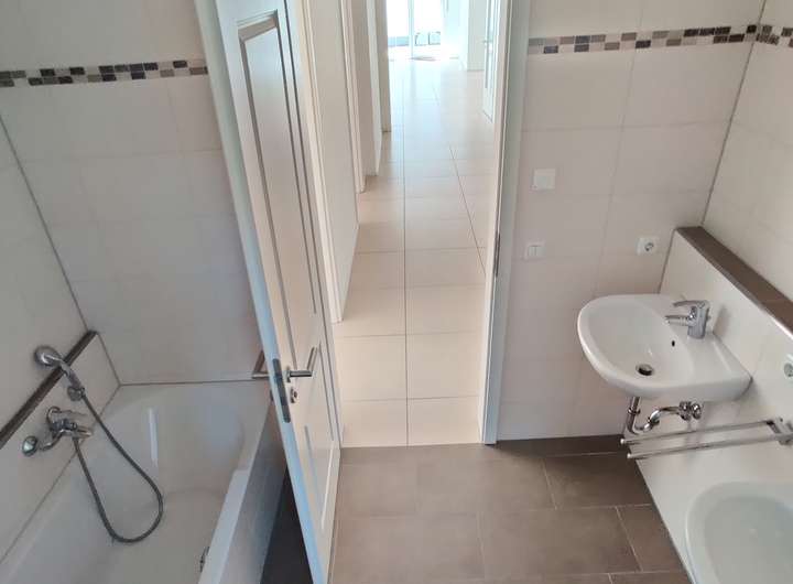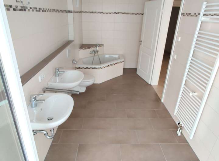 Im Erdgeschoss befinden sich der großzügige Eingangsbereich, das Wohn- und Esszimmer mit offener Einbauküche, das Schlafzimmer, ein Kinderzimmer, ein Badezimmer mit Fenster, WC und Doppelwaschtisch sowie Badewanne, Dusche und ein extra Gäste WC.