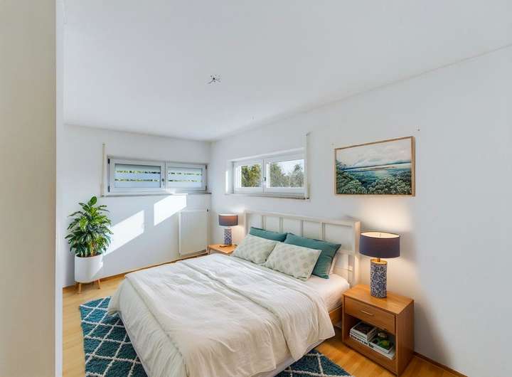 Das Haus verfügt über 6 Zimmer, darunter 5 Schlafzimmer und 2 modern geflieste Badezimmer, die ein harmonisches Gesamtbild schaffen. Hochwertiger Parkettboden in den Wohn- und Schlafbereichen und großzügige Fensterfronten sorgen für ein helles, warmes Wohnambiente. Für Gemütlichkeit und Wohlfühlatmosphäre sorgt der Kamin im Wohnzimmer.