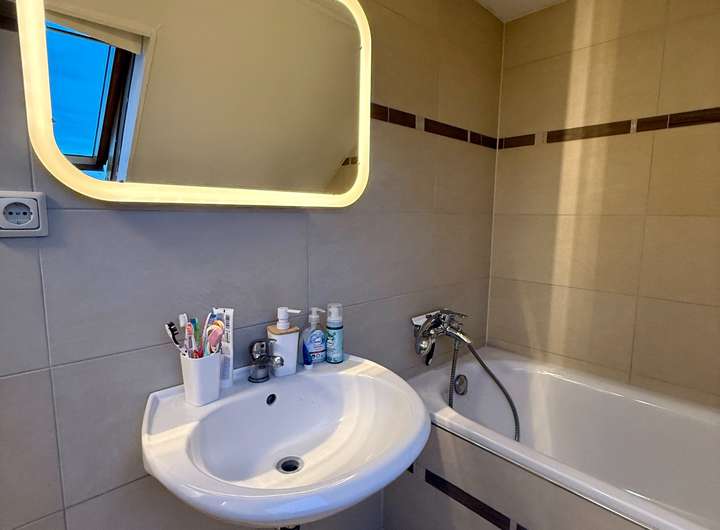 Hier liegt rechts ein großes, modern gestaltetes Tageslichtbad und eine kleine Abstellkammer.