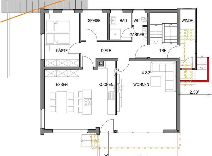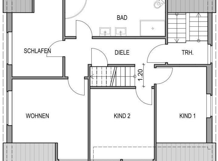 Im Erdgeschoss erwarten Sie neben einem Gäste-WC auch ein Gästebad, das mit einer bodengleichen Dusche und Tageslicht überzeugt – ideal für Besucher. Zudem befindet sich hier ein gemütliches Gästezimmer, das Ihren Gästen einen komfortablen Rückzugsort bietet. Im Dachgeschoss finden Sie vier großzügige Schlafzimmer, die viel Platz für individuelle Gestaltungsmöglichkeiten bieten. Das große Tageslichtbad ist mit einer bodengleichen Dusche, einer eleganten Eckbadewanne und einem Doppelwaschbecken samt praktischen Unterschränken ausgestattet – perfekt für entspannte Wohlfühlmomente.