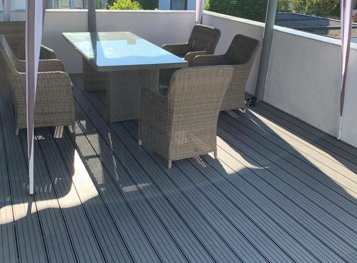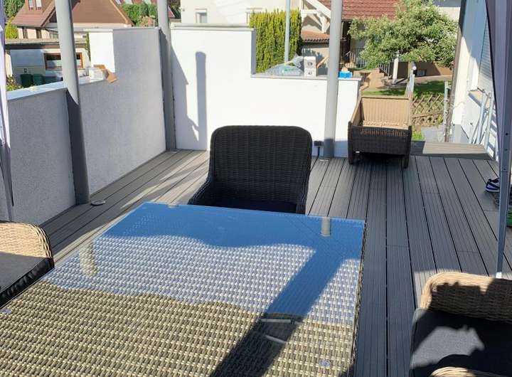 Große Südterrasse: Erleben Sie unvergessliche Sonnenstunden auf der großzügigen Terrasse mit einer Fläche von ca. 24 m². Diese einladende Außenfläche ist perfekt für entspannte Momente im Freien und bietet dank der stilvollen Überdachung aus Glas und integrierten LED-Lichtern eine angenehme Atmosphäre, die auch abends zum Verweilen einlädt.