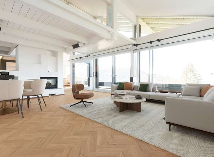 Der offen gestaltete Wohn-, Ess- und Küchenbereich im Obergeschoss beeindruckt mit einem traumhaften Ausblick und einem modernen Design. Die hochwertige Küche lädt zum gemeinsamen Kochen ein, während der Tunnelkamin zwischen Wohn- und Essbereich für eine gemütliche Atmosphäre sorgt.