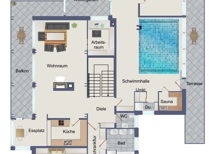 Auch der Außenbereich hat viel zu bieten: Der große Balkon gewährt einen herrlichen Blick auf die Umgebung, während der Wintergarten und die Terrasse ideale Orte für entspannte Stunden im Freien sind. Der weitläufige Garten bietet zahlreiche Möglichkeiten zur individuellen Gestaltung.