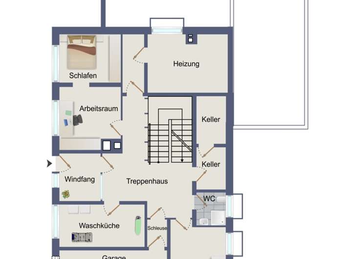 Mit einer Wohnfläche von ca. 317 m² und einer zusätzlichen Nutzfläche von ca. 390 m² bietet das Haus viel Raum für Ihre individuellen Wohnwünsche. Der Eingangsbereich führt Sie in ein vielseitiges Zuhause: Vom gemütlichen Schlafzimmer im Untergeschoss über den lichtdurchfluteten Wohnbereich im Obergeschoss bis hin zur Galerie im Dachgeschoss gibt es viel zu entdecken.