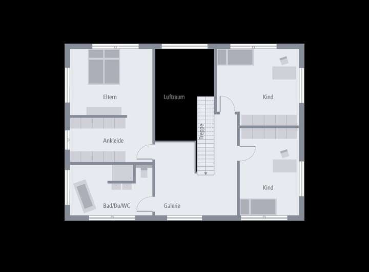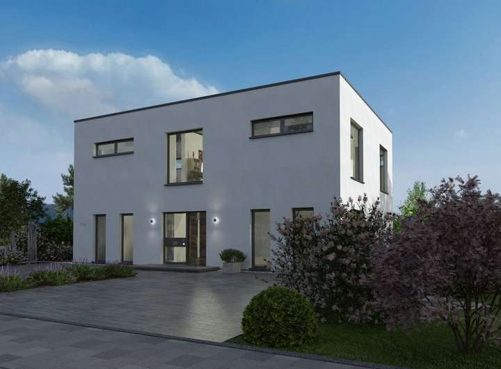 Durch Geradlinigkeit und Symmetrie zeichnet sich unser Black Label 16 aus - und ist damit die perfekte Wahl für all diejenigen, die es schnörkellos und klar möchten. Bereits von außen wird deutlich, was den quaderförmigen Bau neben klaren Linien ausmacht: zahlreiche Fenster, vor allem auf der Gartenseite, sorgen für ausreichend Lichteinfall und lassen den Wohn-Ess-Kochbereich noch größer und einladender wirken. Bereits beim Betreten des mehr als 216 m² großen Einfamilienhauses fällt der Blick dank der offenen Raumgestaltung unmittelbar in den Garten und verstärkt das Gefühl von Weite. Im Erdgeschoss befinden sich außerdem ein sich direkt an die Küche anschließender Hauswirtschaftsraum, Gäste-WC mit Dusche sowie ein geräumiges Büro, das auch als Gästezimmer genutzt werden kann. Das Zentrum des Obergeschosses bildet die große Galerie, die zum Lesen oder Entspannen einlädt. Zudem befinden sich hier das Elternschlafzimmer mit Ankleide, zwei Kinderzimmer und ein Bad mit Wanne, Dusche und WC.