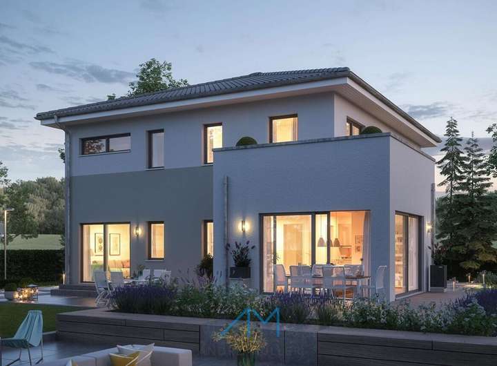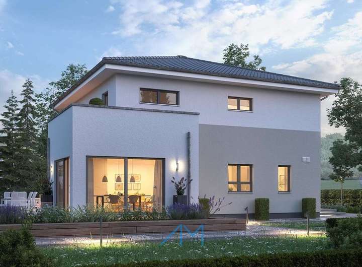 Das Mehrgenerationenhaus von Massa-Haus überzeugt mit einem modernen, kubistischen Stil und viel Raum für seine Bewohner. Ein quadratischer Grundriss und ein formschönes Walmdach sind für seinen Charakter kennzeichnend. Großzügige Räume auf einer gesamten Nettogrundfläche von 206 m² bieten reichlich Platz für gemeinsames Wohnen und Leben mit individuellen Freiräumen.