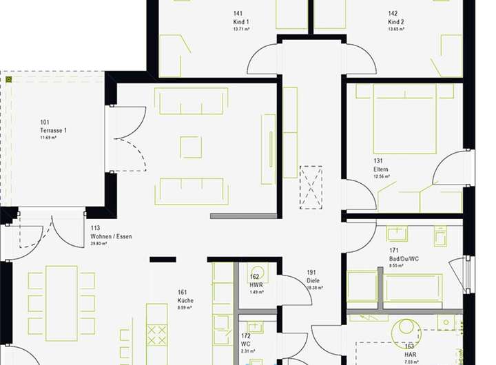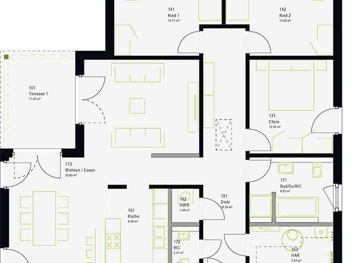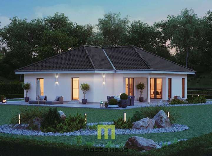 Ihr neues Eigenheim! Ein Bungalow, der Freiluftliebhabern und Komfortsuchenden gleichermaßen gerecht wird. Auf ca. 138 m² Nettogrundfläche entfaltet sich ein Wohntraum, der Individualität und Wohlbefinden in den Vordergrund stellt. Das besondere an diesem attraktiven Walmdach-Bungalow ist seine rechtwinklig versetzte Konzeption, die sowohl einen überdachten Sitzplatz als auch eine angrenzende Freiterrasse bietet - ideal für entspannte Stunden im Freien, egal ob bei Sonnenschein oder warmem Regen. Im Inneren des Hauses erwartet Sie ein offen gestalteter Wohn-, Ess- und Küchenbereich, der als Herzstück des Hauses dient. Zusätzlich bietet der Bungalow ausreichend Platz für ein Duschbad, ein großes Badezimmer sowie zwei großzügige Kinder- und ein Elternzimmer. Der ComfortStyle - wo das Leben drinnen und draußen gleichermaßen genossen wird.