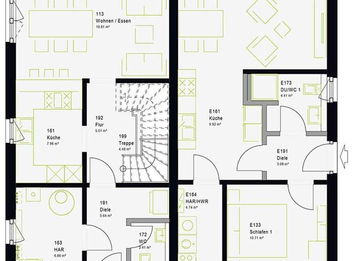 Auf einer gesamten Nettogrundfläche von 206 m² finden Sie großzügige Räume, die reichlich Platz für gemeinsames Wohnen und Leben mit individuellen Freiräumen bieten. Im Erdgeschoss eröffnet die raumsparend geschnittene Einliegerwohnung flexible Alternativen passend für jegliche Wohn- und Lebenssituationen.