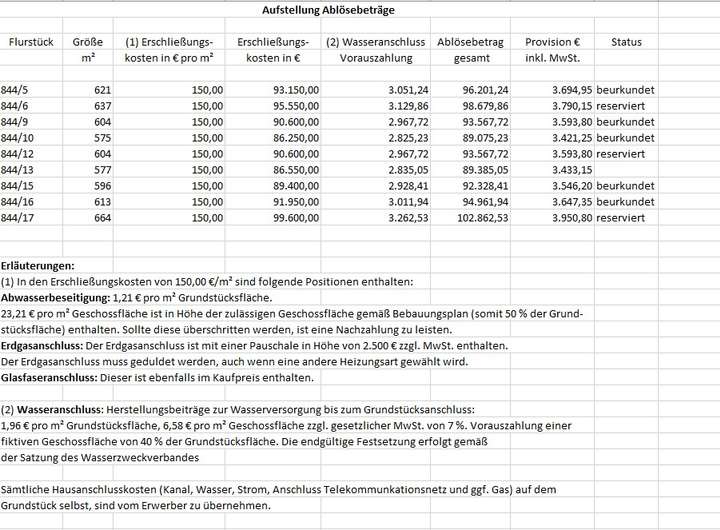 Als Beispielgrundstück wird die Fl.-Nr. 844/13 mit der Größe von 577 m² dargestellt. Beim Erwerb sind die bereits vom Erbbaurechtsgeber bezahlten Erschließungskosten zu erstatten. Bei diesem Grundstück betragen die Erschließungskosten 89.385,05 EUR. Die Erschließungskosten sämtlicher Grundstücke sind aus der beiliegenden Aufstellung ersichtlich.