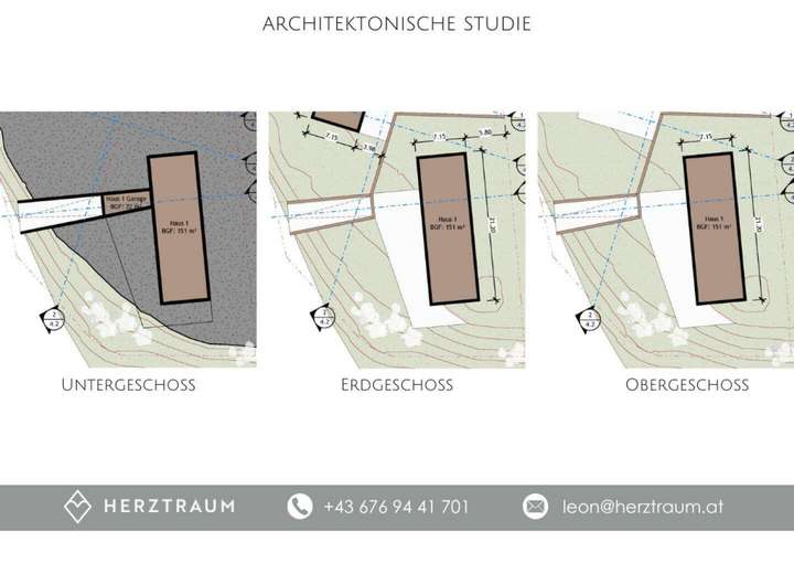 Geplante Flächenaufteilung:Untergeschoss (UG): 151 m2Erdgeschoss (EG): 151 m2Obergeschoss (OG1): 151 m2Gesamte Wohnnutzfläche: 453 m2Garage: 22 m2