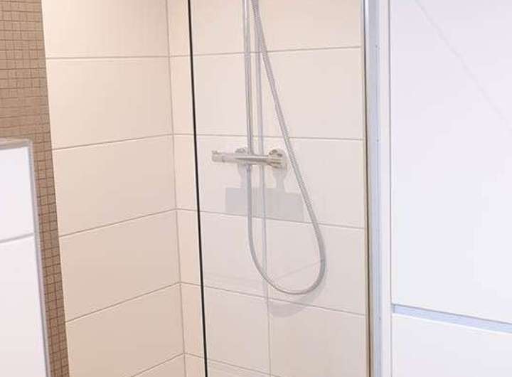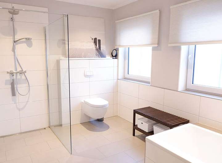 - Bad mit gefliestem Duschboden und Duschabtrennung in Glas, Badewanne, 2 Waschtische und wandhängendem WC