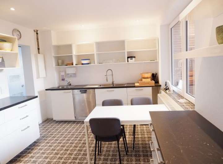 - Ladenküche (Front: weiß) ausgestattet mit Gasherd, E-Backofen, Dunstabzugshaube in Edelstahl (außen), Geschirrspülmaschine, separater großer Kühlschrank, drei Spülbecken, marmorierte Küchenarbeitsplatte sowie diversen Ober- und Unterschränken und mehrere Tische und Stühle