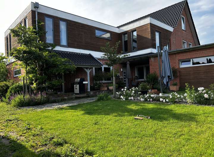 Das Haus wurde ca. 1950/60 in konventioneller Massivbauweise mit Teilkeller erstellt und ca. 2015 und ca. 2020 umfangreich entkernt, erweitert und modernisiert. Die Aussenwände sind mit rotem Verblendmauerwerk bzw. die Fassade im Bereich der Penthouse-wohnung mit Lärchenholz im Rhombusprofil verkleidet. Bei dem Dach handelt es sich um ein Satteldach und ein Flachdach. Das Satteldach ist mit anthrazitfarbenen Dachpfannen eingedeckt, die Flachdächer sind mit Dachpappe abgedichtet.