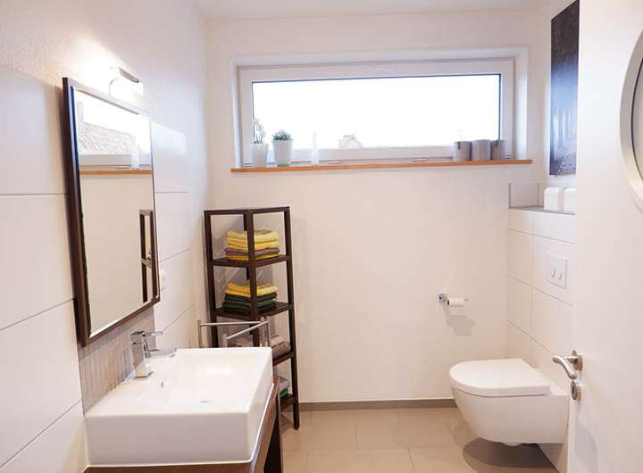 - Gäste-Bad mit gefliestem Duschboden und Duschabtrennung in Glas, Waschtisch und wandhängendem WC