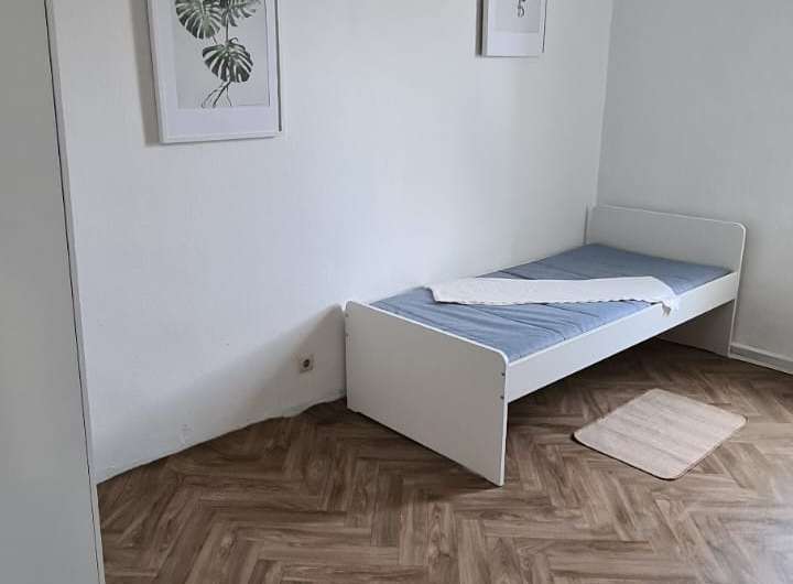 Möbliertes Zimmer, Bett, Tisch, Kleiderschrank, Stühle, Küche, Dusche (Toilette im Gang)