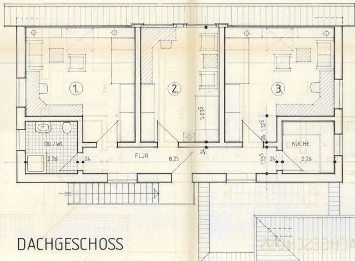 - Dachgeschosswohnung mit ca. 85 m² Wfl., 3 Zimmer, Küche, Bad und Balkon. Die Wohnung ist derzeit vermietet.