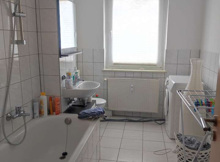 Das Tageslichtbad ist sehr geräumig und verfügt über Wanne mit Duschaufsatz, WC und WM-Anschluss. Die Küche wurde aktuell mit modernen Glanzfliesen versehen und eine neue Einbauküche eingebaut.