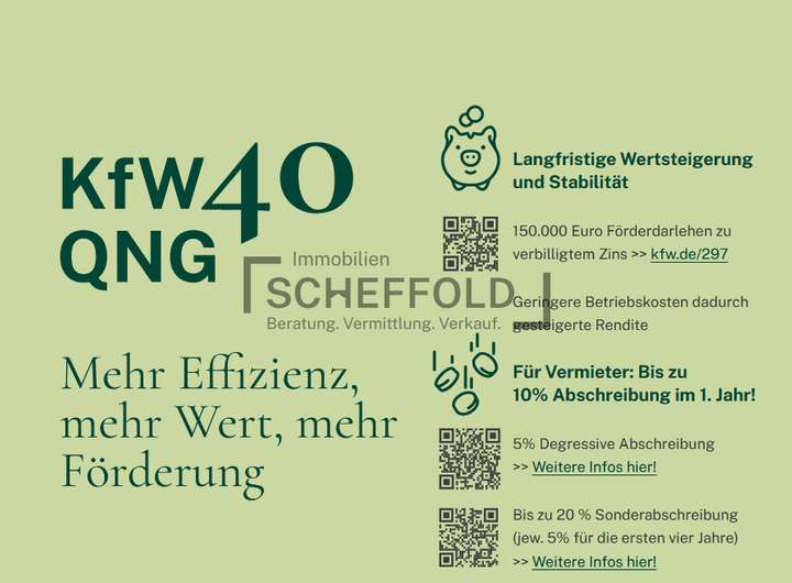 Dank der hohen Nachfrage nach nachhaltigen Immobilien profitieren Sie von einer langfristigen Wertsteigerung und einem höheren Wiederverkaufswert. Zusätzlich sichern Sie sich attraktive staatliche Förderungen: Derzeit gibt es für KfW40-Gebäude ein Darlehen von 150.000 Euro zu verbilligtem Zins sowie erhebliche Steuervorteile, darunter bis zu zehn Prozent Sonderabschreibung in den ersten vier Jahren bei Vermietung.