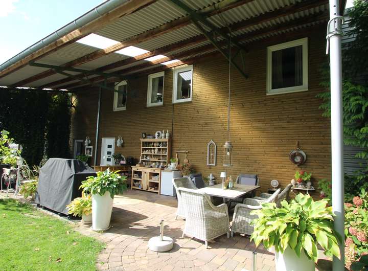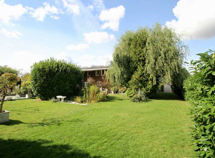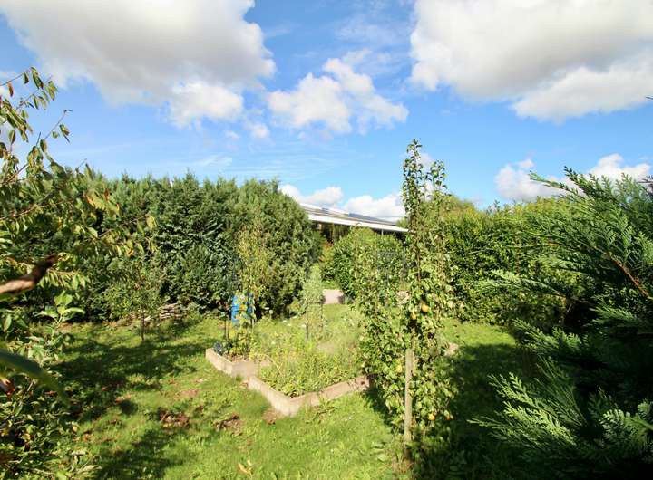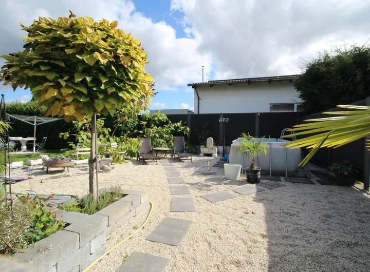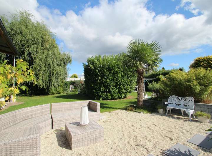 Der großzügige Garten ist ein Highlight des Anwesens und wurde mit viel Liebe zum Detail gestaltet. Er verfügt über einen Jacuzzi, einen Aufstellpool sowie einen kleinen Teich und bietet verschiedene Sitzecken zum Entspannen. Ein kleiner Gemüse- und Obstgarten rundet das idyllische Gesamtbild ab und bietet Möglichkeiten für Selbstversorger.