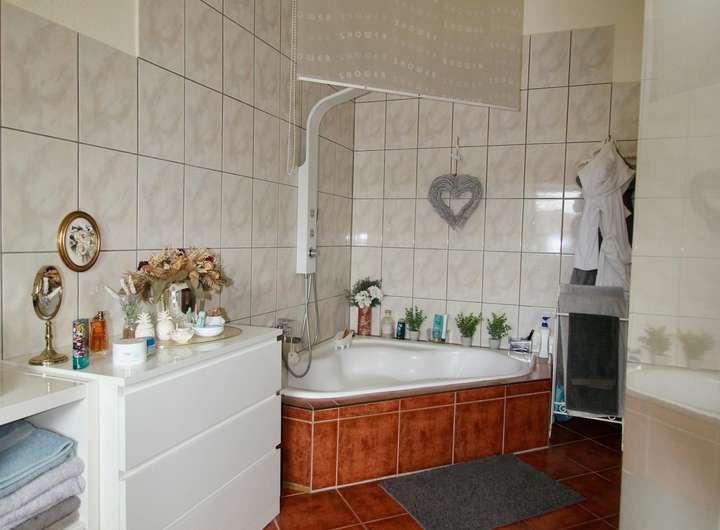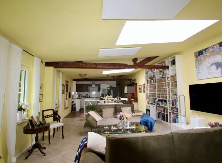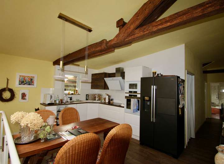 Die Wohnung im Obergeschoss erstreckt sich über 145 m² und überzeugt mit einer hochwertigen Ausstattung. Im Zentrum steht eine neue, exklusive Einbauküche, die höchsten Ansprüchen gerecht wird. Der Wohnbereich bietet großzügigen Platz für komfortables Wohnen, während das Schlafzimmer, ein weiteres Zimmer (ideal als Büro oder Kinderzimmer) sowie ein großes Tageslichtbad mit Badewanne und Fußbodenheizung für maximalen Komfort sorgen. In allen Räumen wurde eine moderne Fußbodenheizung installiert, die für ein behagliches Raumklima sorgt.