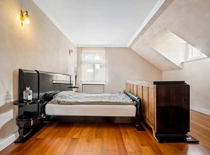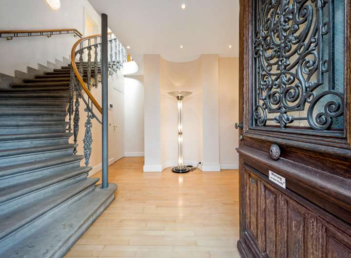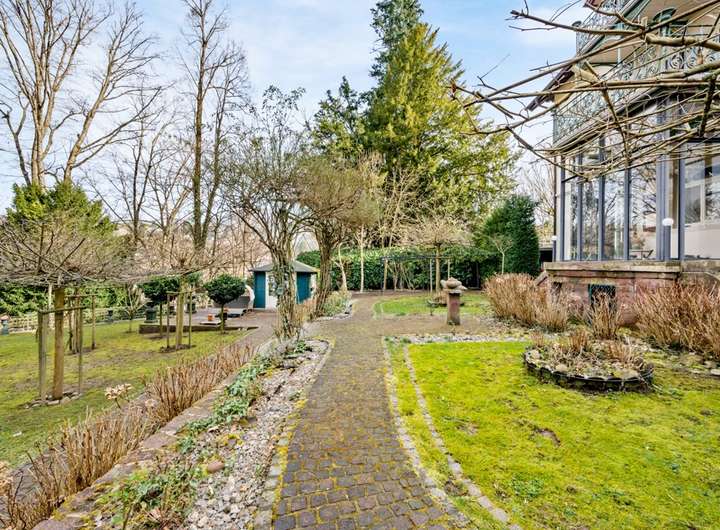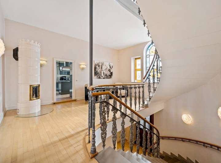 Bereits beim Betreten beeindruckt das elegante Entree mit einer geschwungenen historischen Treppe, die den repräsentativen Charakter des Hauses unterstreicht. Stilelemente wie kunstvolle Flügeltüren, schmiedeeiserne Details, edle Sandstein-Elemente und Balkonbalustraden verleihen der Villa ihren einzigartigen Charme.