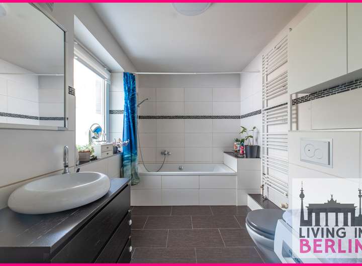 Das Tageslichtbad verfügt über ein wandhängendes WC, eine Badewanne, ein Waschbecken und einen Strukturheizkörper. Auch Platz für die Waschmaschine findet sich hier. Es ist modern gefliest und ausreichend groß, um Schränke oder Regale für Ihre Kosmetika unterzubringen. An der hinteren Wand, welche zugleich die Außenwand darstellt, gibt es ein Feuchtigkeitsproblem. Anscheinend erfolgte hier eine Abdichtung nicht fachgerecht. Die Instandsetzungskosten belaufen sich auf ca. 2.000€ und wurden im Kaufpreis bereits berücksichtigt, Gleiches gilt für den Strukturheizkörper, welcher aufgrund abblätternden Lacks neu lackiert oder ausgetauscht werden sollte.