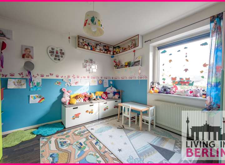 Der sich ebenfalls im Erdgeschoss befindliche aktuell als Kinderzimmer genutzte Raum, kann auch zum Elternschlafzimmer umfunktioniert werden. Ausreichend Platz für ein Doppelbett und einen Kleiderschrank ist vorhanden.